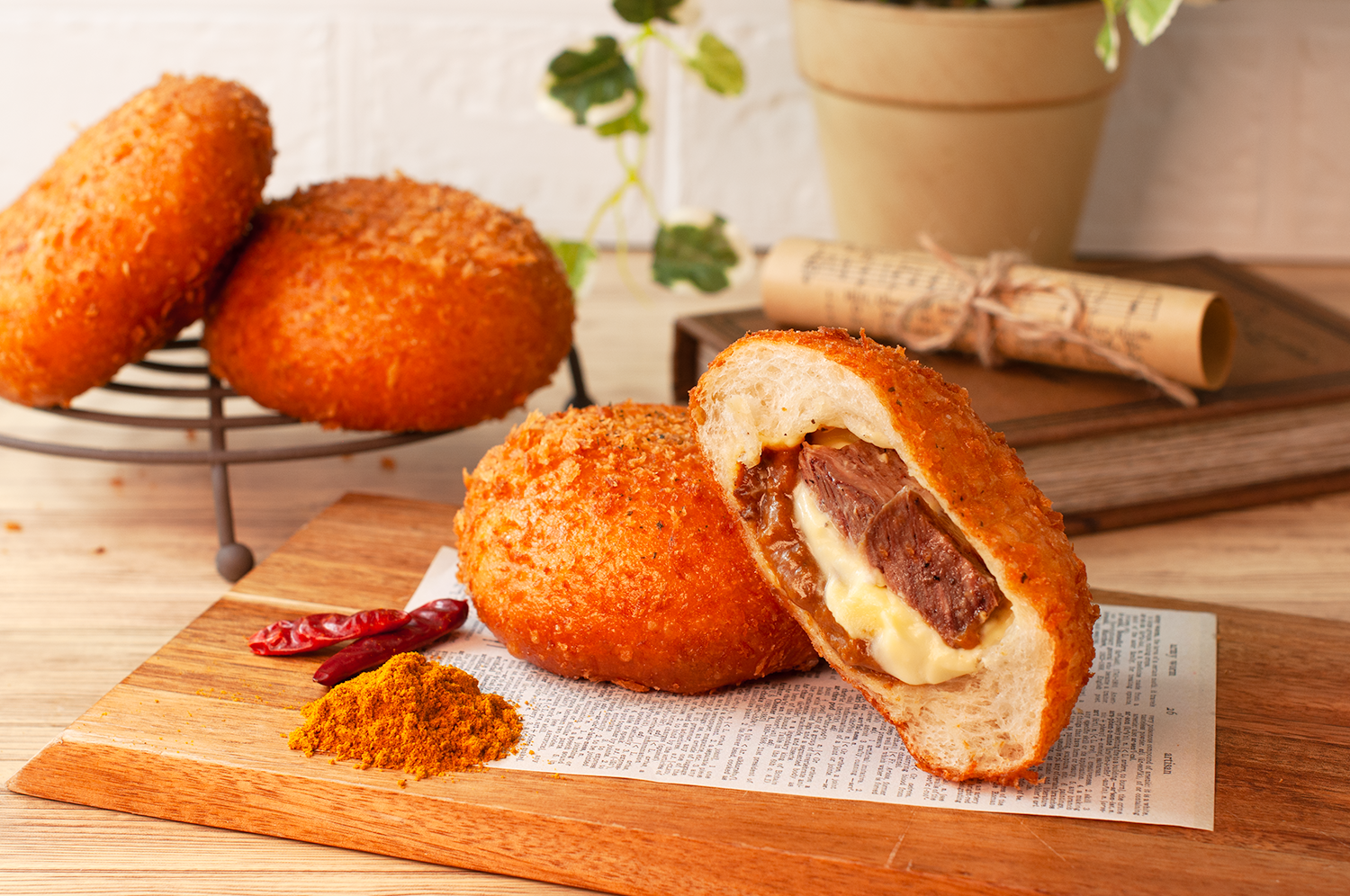 北海道産小麦「ゆめちから」を100%使用したパン生地で、特製カレールーと、北海道産生乳から作られたフォンデュチーズを包み込み、カリッと揚げています。衣はサクサク、パン生地はもっちり。ひと口かじると、中からとろ〜りと溶け出すチーズと、コク深いカレーが広がります。