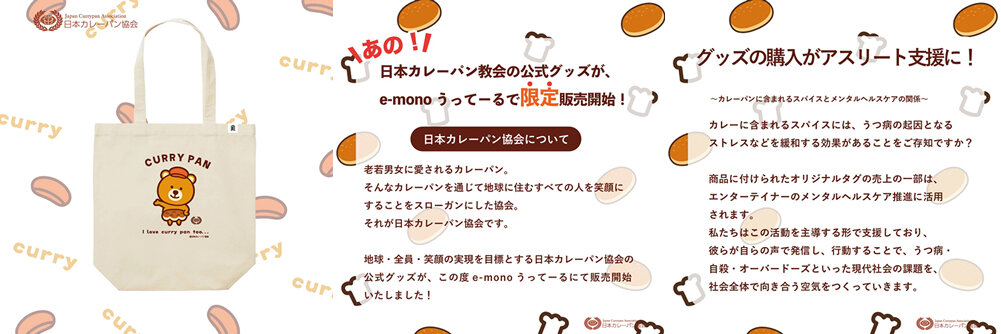 老若男女に愛されるカレーパン。 そんなカレーパンを通じて地球に住むすべての人を笑顔に することをスローガンにした協会。 それが日本カレーパン協会です。地球・全員・笑顔の実現を目標とする日本カレーパン協会の 公式グッズが、この度E-monoうってーるにて販売開始 いたしました!