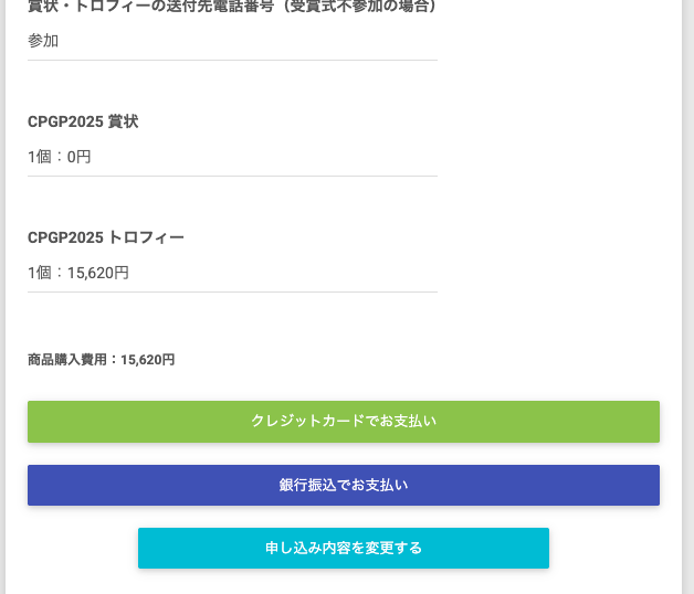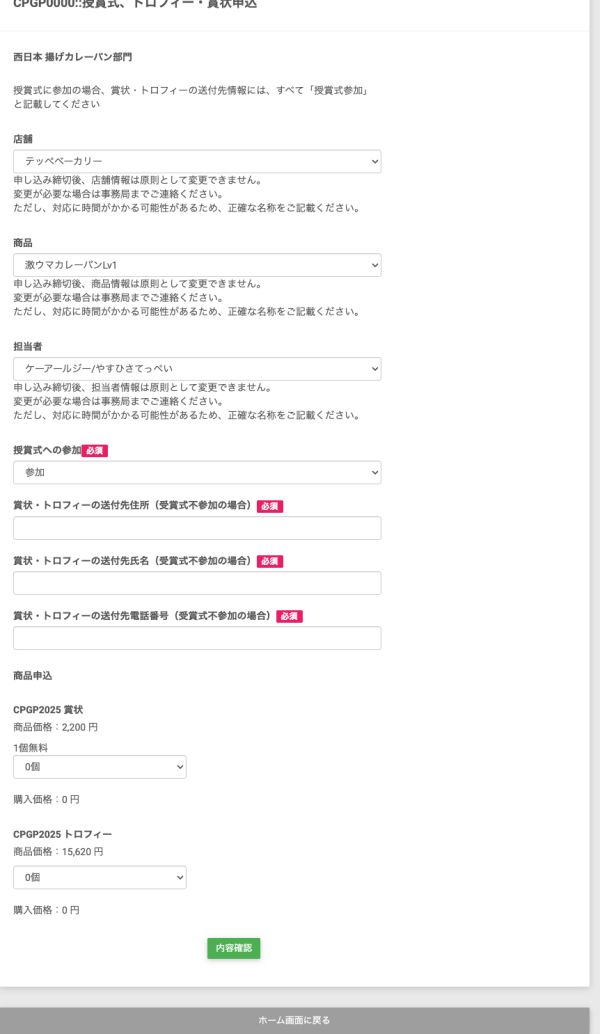 上記画面で、[ 申し込み ]ボタンを押して授賞式の参加可否、トロフィー・賞状の申込を進めてください。