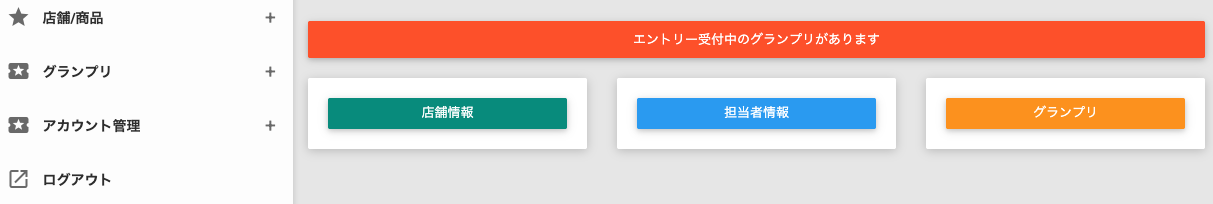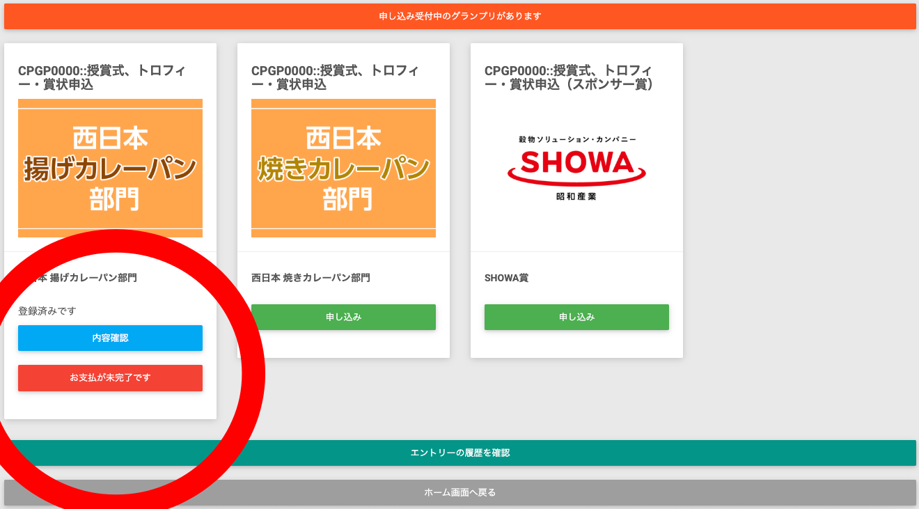 受賞をしていると、画面の上部にオレンジ色の注意喚起バーが表示されその中に「エントリー受付中のグランプリがあります」リンク が表示されますのでクリックして進むと、下記画面が表示されます。